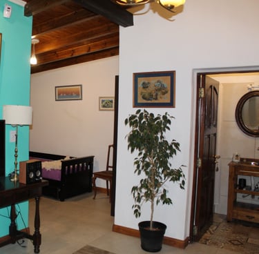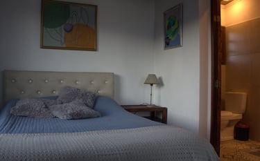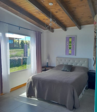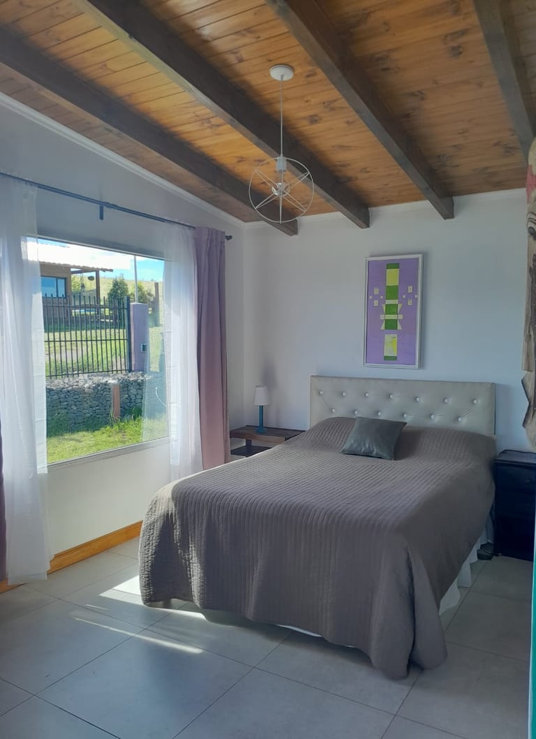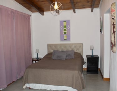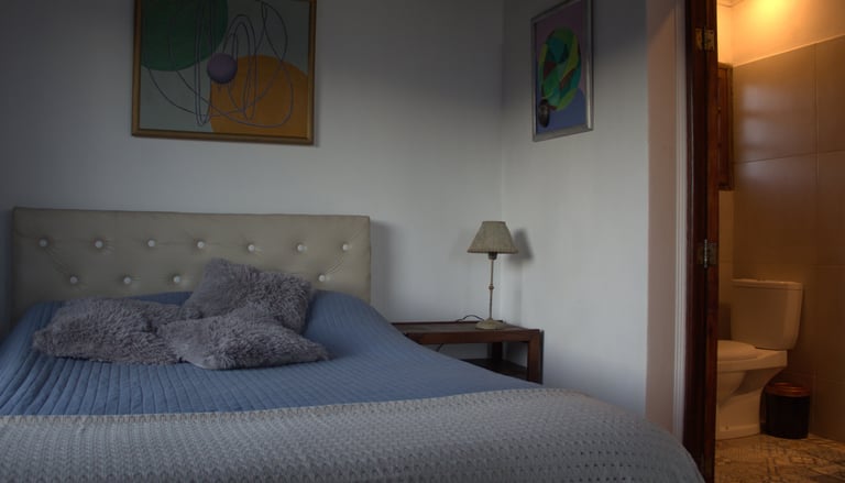 La habitación principal ofrece calefacción, una cama de dos plazas con baño privado, y está totalmente equipada con lámparas, tendidos de cama y un placard para guardar ropa. Un espacio elegante y funcional, perfecto para su comodidad y descanso.