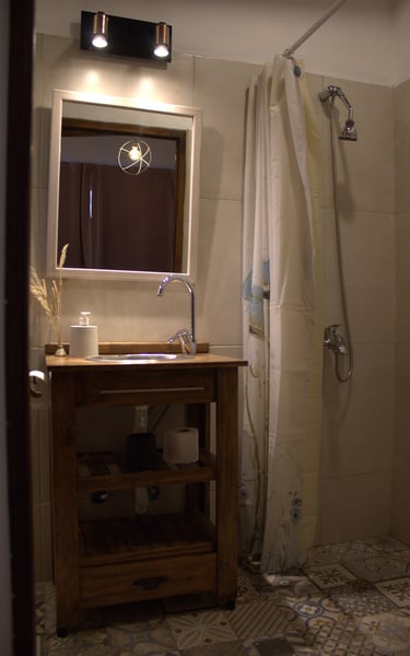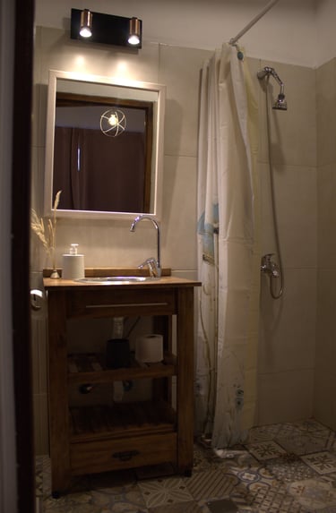 El baño cuenta con una elegante ducha y comodidades esenciales. ofrece un ambiente cómodo y acogedor que complementa la estética moderna del espacio, ubicado en el linving del loft.